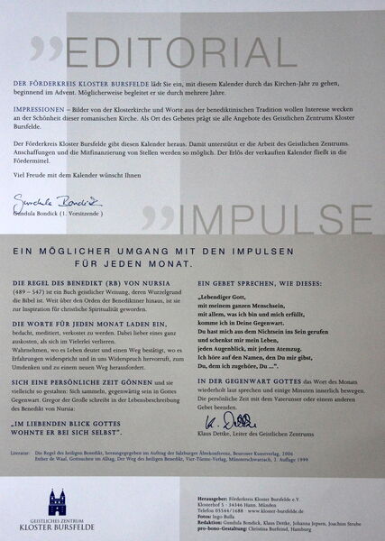 Der Förderkeis Kloster Bursfelde gibt diesen Kalender heraus. Damit unterstützt er die Arbeit des Geistlichen Zentrums, Anschaffungen und die Mitfinanzierung von Stellen werden so möglich. Der Erlös der verkauften Kalender fließt in die Fördermittel.